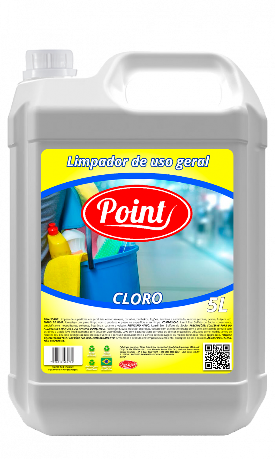 A principal finalidade do Cloro Point é proporcionar uma limpeza completa e desinfecção de alto nível em diversas superfícies e ambientes. Ideal para cozinhas, banheiros, áreas externas, pisos e até mesmo na lavagem de roupas, o Cloro Point atua na remoção de sujeiras difíceis, manchas e odores, deixando os ambientes limpos e livres de micro-organismos nocivos. Sua ação eficiente ajuda a prevenir doenças e a manter a saúde da família, tornando-o indispensável na rotina de limpeza doméstica.